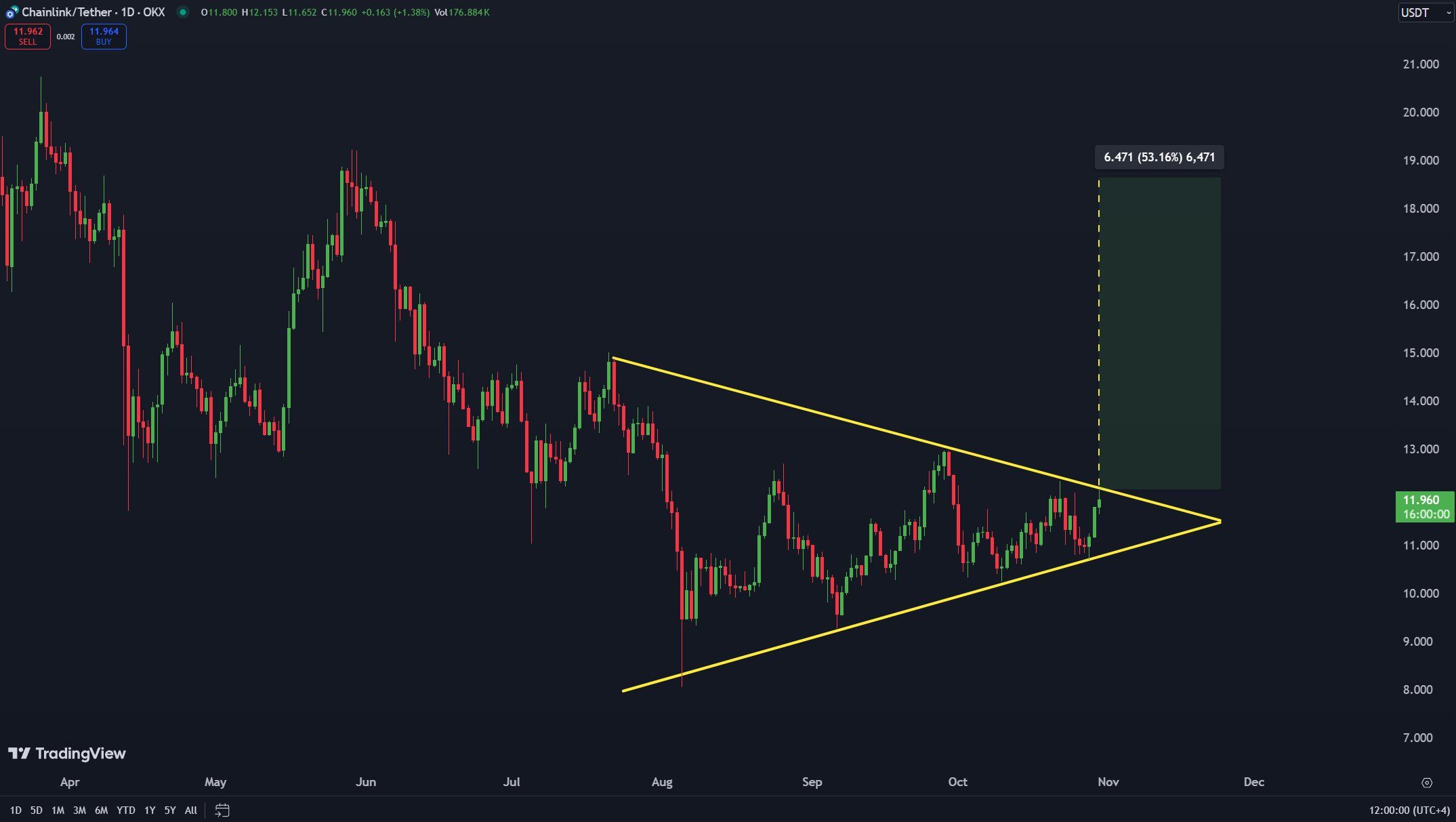 Analytikerns synpunkt tyder på att ett genombrott från det makrobulliga mönstret kan skicka LINK mot 19 USD. Men först måste altcoin säkra 13 USD som ett stödgolv för att ens försöka en 53%-ig hopp.