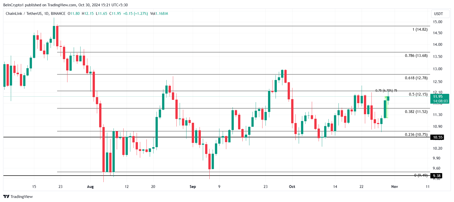 Chainlinks pris steg med 6% under de senaste 24 timmarna, och siktar nu på att stänga över 12,15 USD, i linje med 50%-iga Fibonacci Retracement-linjen. Denna nivå har agerat som ett betydande hinder för LINK, vilket är avgörande för att etablera ytterligare uppåtrörelse. Ett stängande över 12,15 USD skulle signalera en starkare hausseartad utsikt för altcoin.