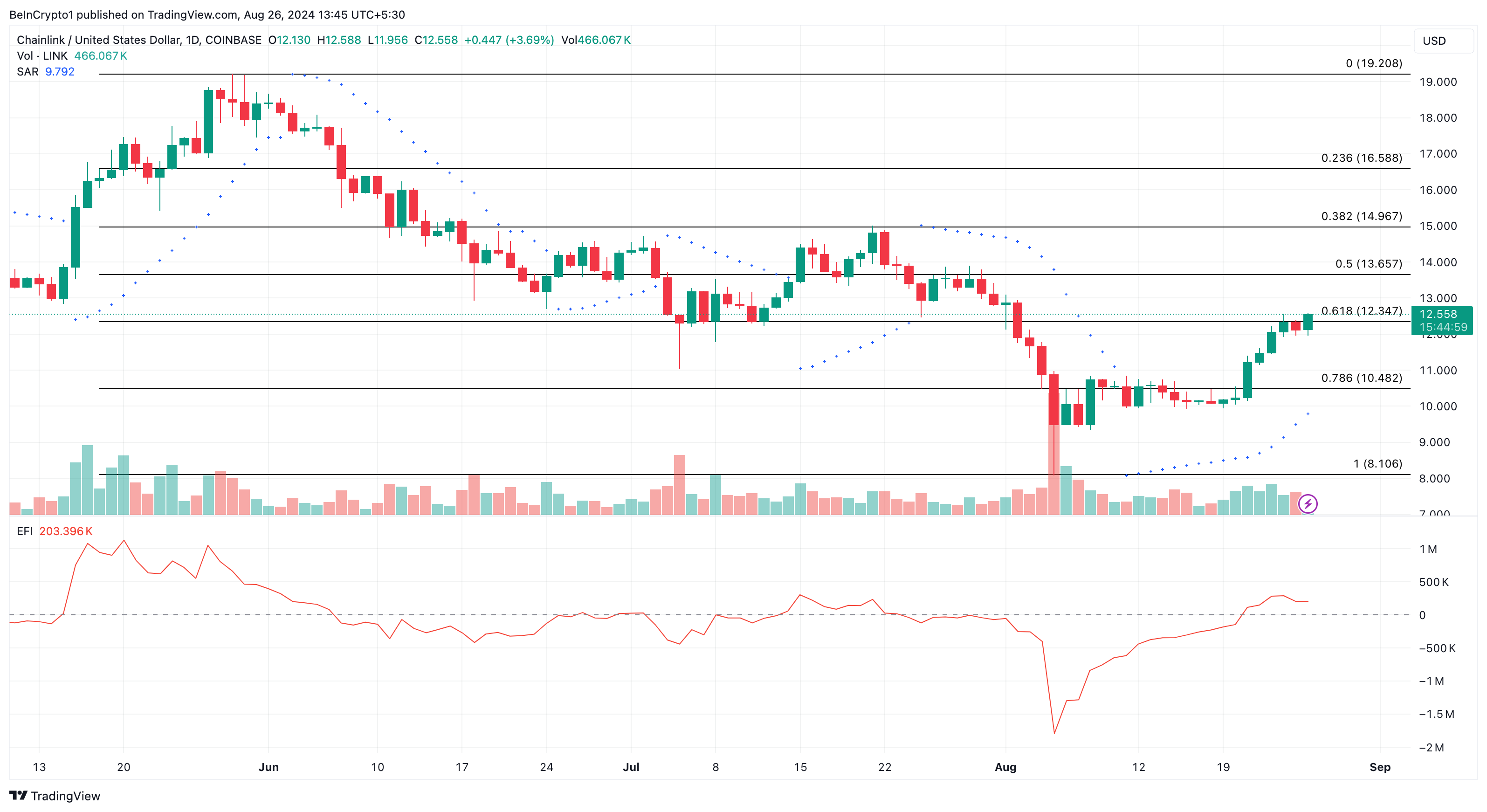 Vanligtvis, om punkterna är ovanför priset, är det en säljsignal. Men vid publiceringstidpunkten är Parabolic SAR under LINK:s värde på 12,55 USD. Om detta förblir detsamma kan LINK fortsätta att öka.