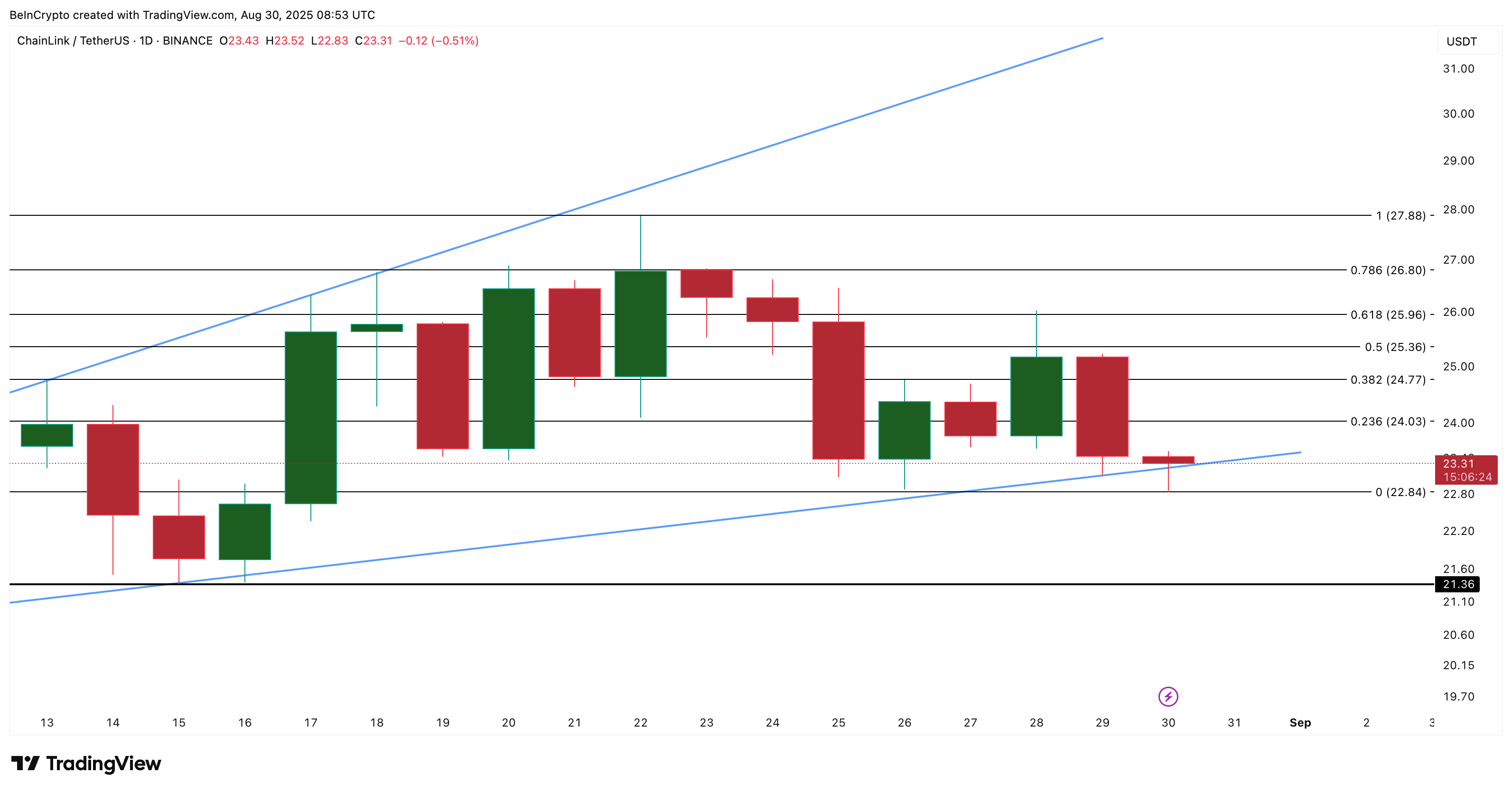 Det dagliga diagrammet förstärker denna försiktighet. LINK-priset handlas för närvarande till 23,31 USD, inom ett stigande breddande kilmönster — en struktur som ofta förknippas med förlust av uppåtgående momentum nära slutet av en hausseartad fas. Detta “megafon”-liknande mönster är känt för att starta björnaktiga vändningar, en risk som nu hotar LINK.
