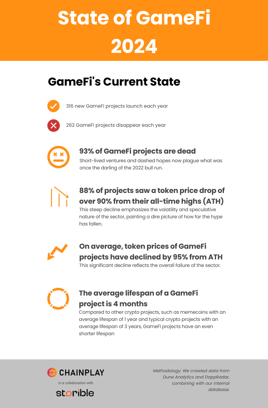 Enligt en ny rapport från ChainPlay är 93% av Web3 GameFi-projekten döda. Företaget analyserade 3 279 projekt och fann att det genomsnittliga värdet på applikationerna har minskat med 95% från sin högsta nivå.
