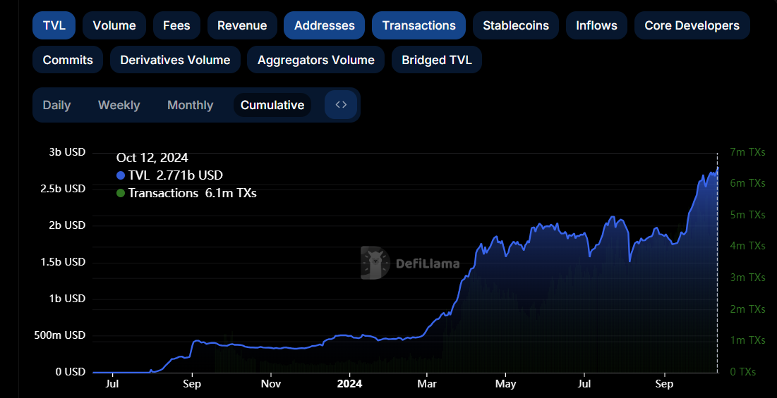 Under de senaste tre dagarna har Base upplevt en märkbar ökning i transaktionsvolymen, med konsekvent bearbetning av över 6 miljoner transaktioner varje dag. Enligt data från DeFillama nådde nätverket denna topp den 10 oktober, då det registrerade 6,2 miljoner transaktioner.