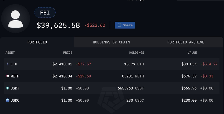 Coinbase-chefen Conor Grogan identifierade FBI:s plånboksadress. Han upptäckte att den innehåller tokens som EthereumMax, BONE och flera meme-mynt, alla på Ethereum-blockkedjan.