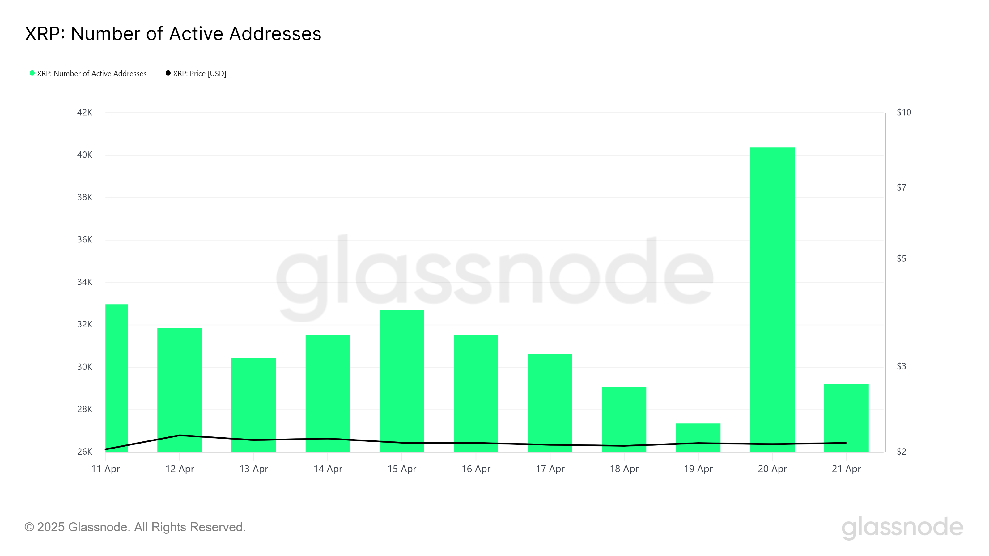 Ny data från blockkedjan visar en kraftig ökning av nätverksaktivitet, vilket ytterligare stärker fallet för XRP-terminer. Data visar att aktiva XRP-adresser ökade med 67,5 % mellan 19 och 20 april, inför Coinbase Derivatives’ debut av XRP-terminer, från 27 352 till 40 366.