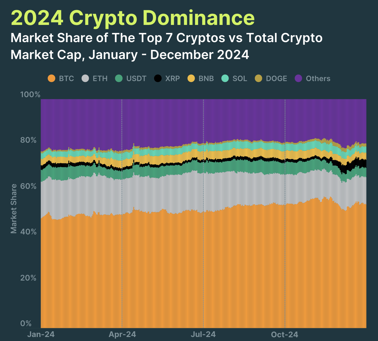 Sammanfattningsvis ökade det totala kryptomarknadsvärdet med 97,7 % under det senaste året och slutade på hela 3,4 biljoner USD. Momentumet var inte stabilt under året, eftersom Q3 såg vissa tillbakagångar och långsammare framsteg.