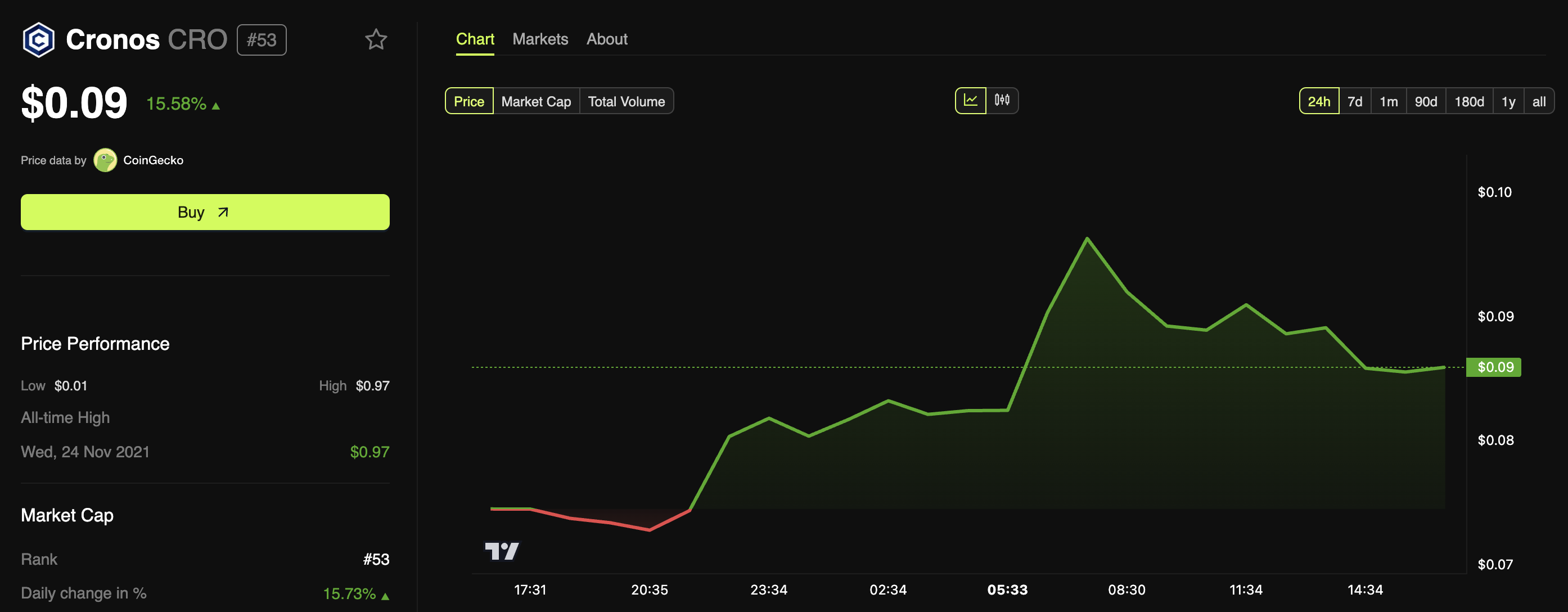 Vid pressens tidpunkt handlades CRO till 0,09 USD. Detta markerade en ökning med 15,5 % under det senaste dygnet.