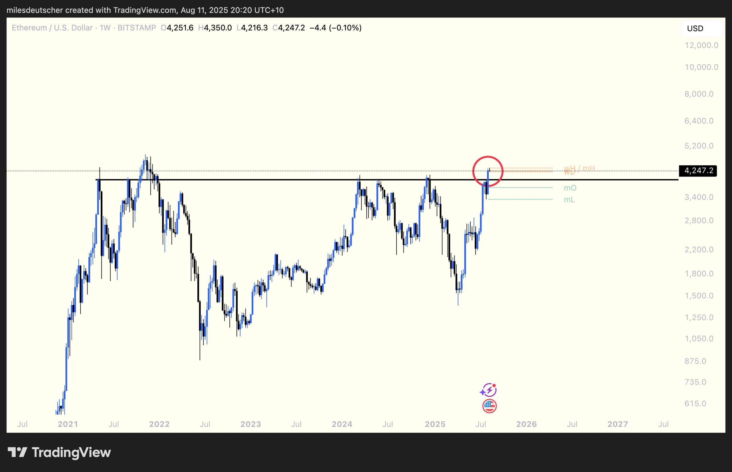 Enligt Miles är en annan faktor att ETH återtar 4 000 USD-nivån—en flerårig högsta nivå—vilket ger stark momentum mot sitt all-time high från 2021. Både BTC och ETH vägrar att bryta ner, även med tung FUD. Detta tyder på säljarexhaustion tillsammans med stadig marknadsefterfrågan.