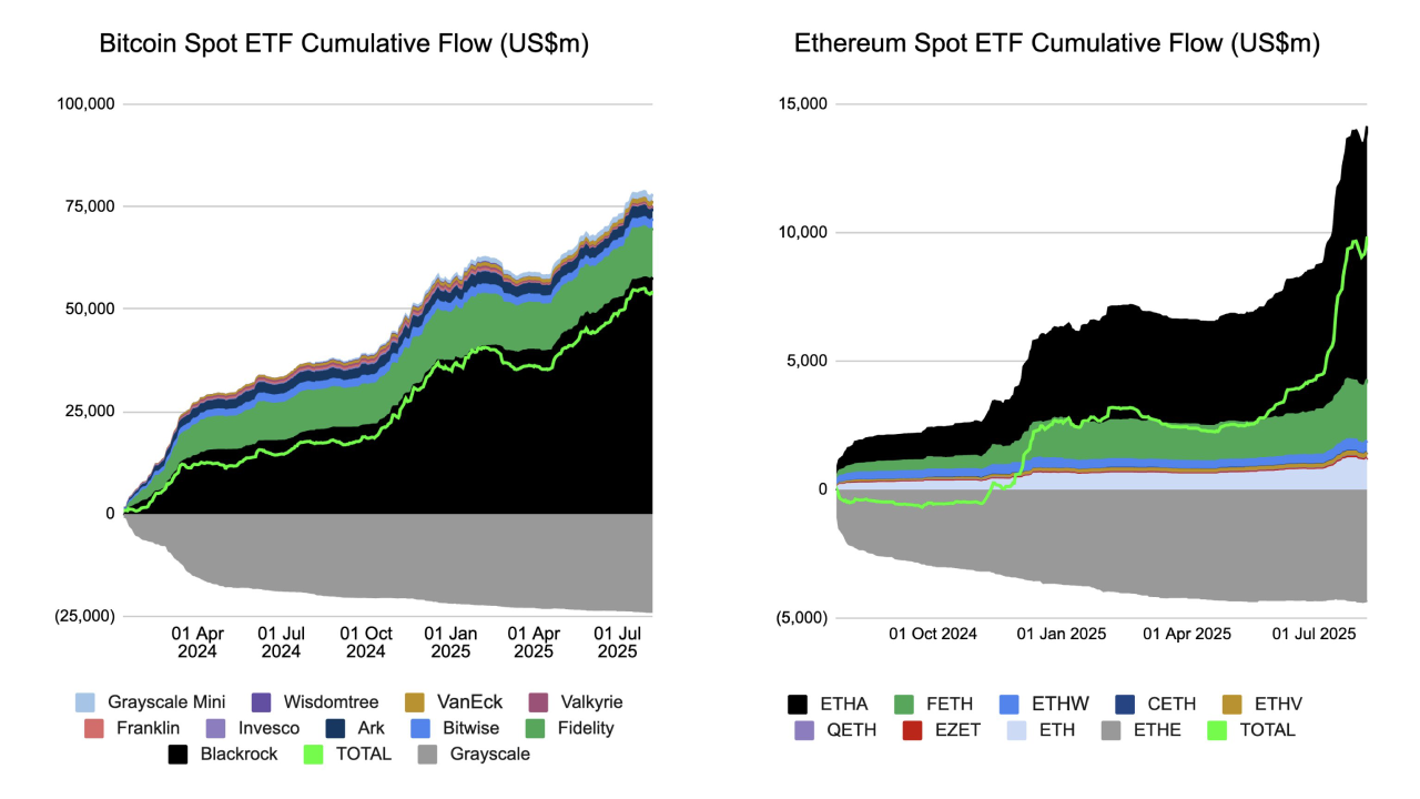 För det första visade data att totala inflöden i USA-noterade krypto-ETF:er nådde cirka 12,8 miljarder USD i juli. Miles betonade också att “spot BTC & ETH ETF:er ensamma” har attraherat runt 17 miljarder USD i nettoinflöden de senaste 60 dagarna. Detta har påverkat likviditeten och värderingen av dessa tillgångar avsevärt.