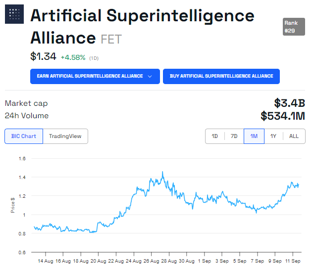 Enligt BeInCryptos data har Artificial Superintelligence Alliance (FET) token ökat nästan 5% på denna rapport. För närvarande handlas den för 1,34 USD.