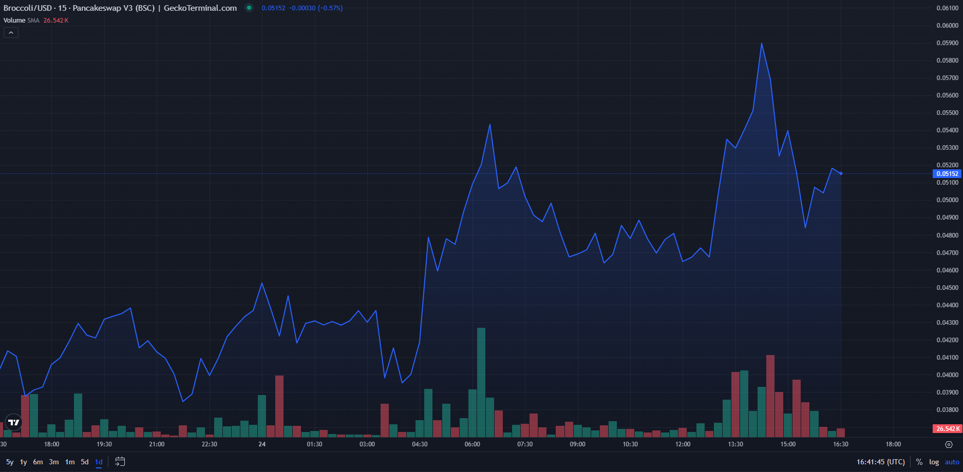 Men ett BNB-projekt gynnades faktiskt av uppmärksamheten på sociala medier. BROCCOLI, en meme coin uppkallad efter CZ:s hund, steg med nästan 33 % idag.