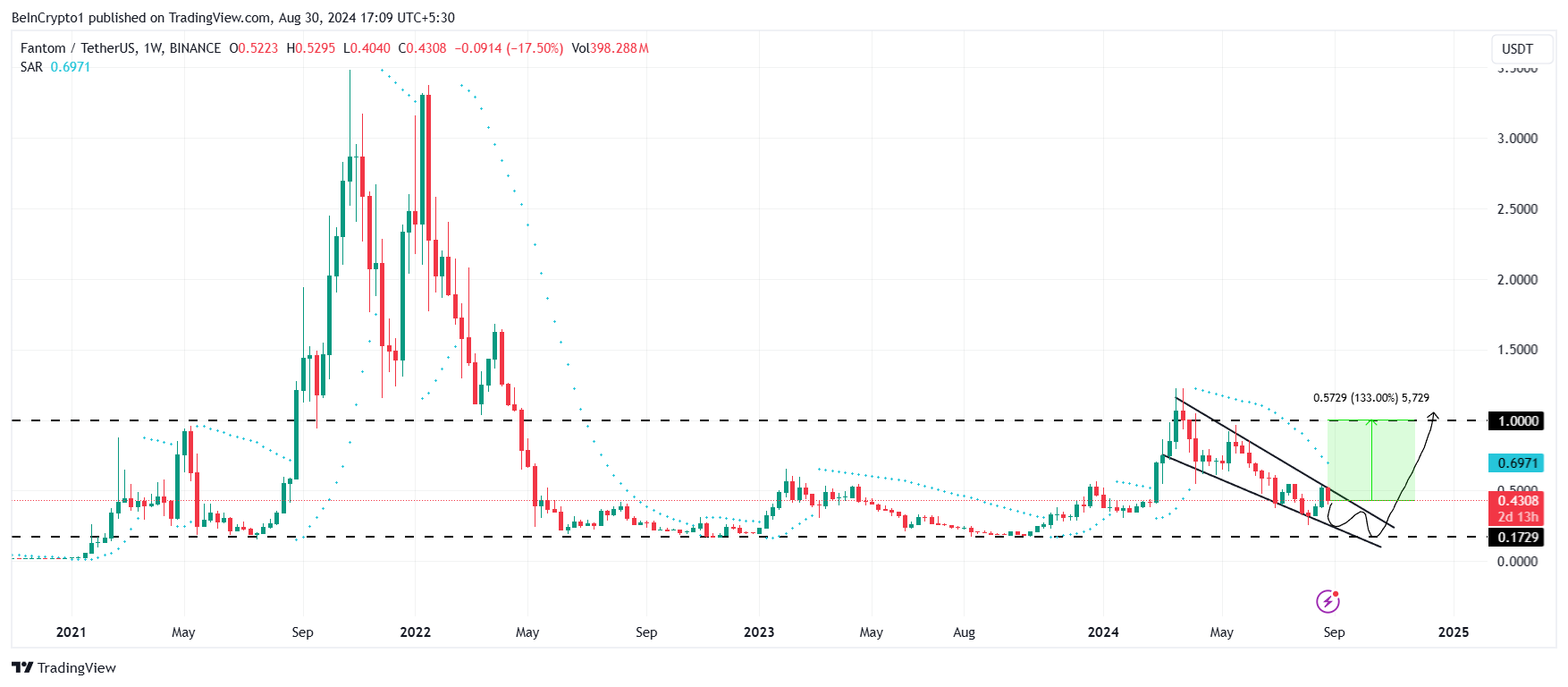 Historiskt sett har en studs från denna nivå lett till exceptionella ökningar, och övergången till Sonic i kombination med detta kan skicka Fantoms pris till 1,0000 USD. Följaktligen kommer september troligen att ställa in FTM för att notera en ökning på 133% från dess nuvarande pris.