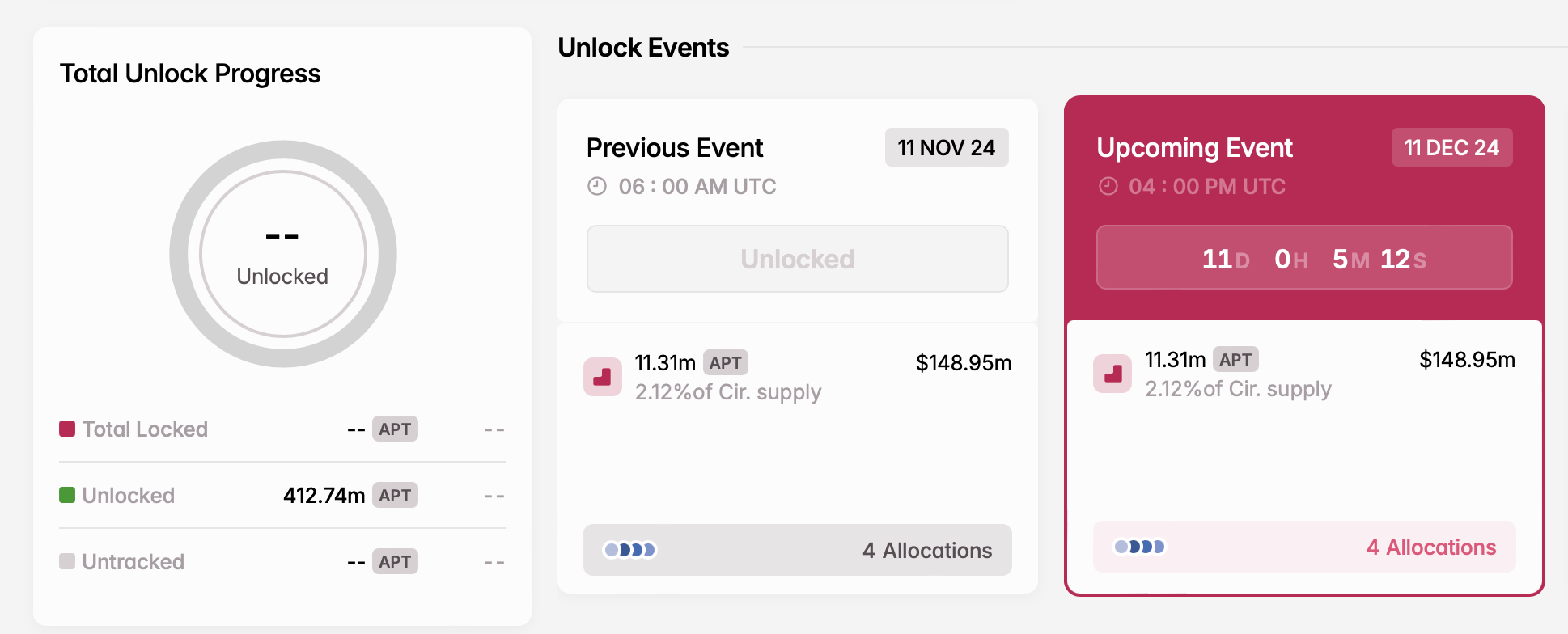 Aptos kommer att låsa upp 11,31 miljoner APT-tokens den 11 december, vilket motsvarar 2,12 % av dess totala utbud. Dessa tokens har ett totalt värde av 149,85 miljoner USD. Fördelningen kommer att vara följande: