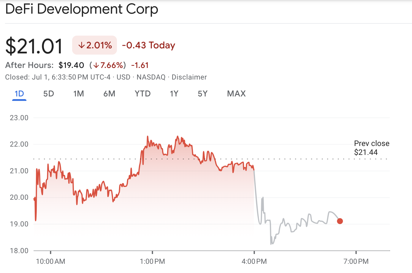 Sedan erbjudandet tillkännagavs har DeFi Developments aktie fallit över 9 % i efterhandel. Nedgången började mindre än 30 minuter efter företagets sociala medieutannonsering, vilket kan vara ett dåligt tecken.