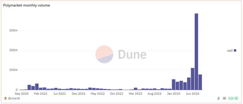 Brevet nämner inte specifika plattformar men följer en rekordhög nivå för prognosmarknadsplattformen Polymarket. Enligt data från en Dune-instrumentpanel nådde Polymarkets månatliga volym 387,03 miljoner dollar i juli. Denna ökning drivs av ökad förväntan och diskussion kring det kommande amerikanska valet i november.