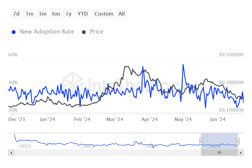GRT-priset kan ha noterat en nedåtgående trend, men dess önskan bland kryptoentusiaster förblev som den är. Detta är uppenbart i tillgångens användningsgrad. Adoptionsgraden mäter koncentrationen av nya investerare bland de deltagande adresserna.