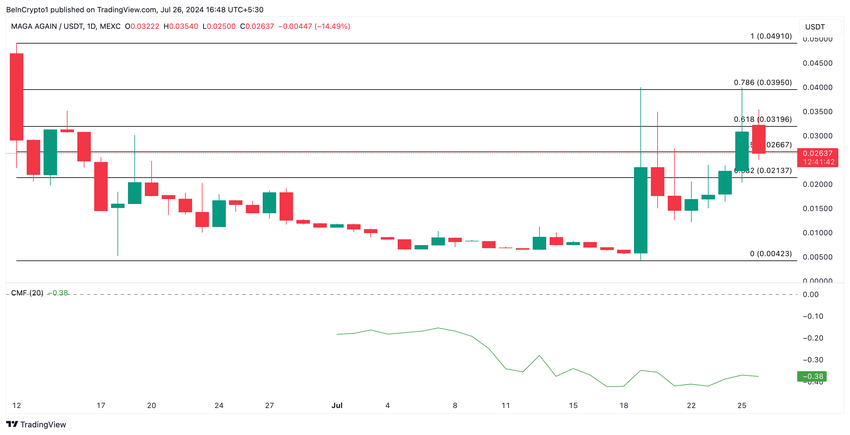 Denna ökning kan dock bli kortlivad, eftersom en faktisk efterfrågan inte stöder rallyt för meme-myntet. Detta är baserat på avläsningar från tokens Chaikin Money Flow (CMF). Vid presstillfället ligger MAGAA:s CMF under nolllinjen vid -0,37.
