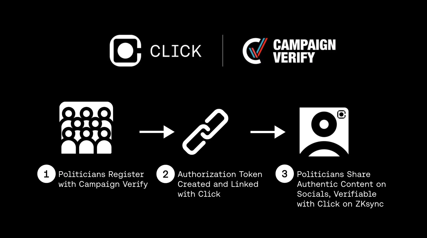Click, en mobilapp som drivs av Nodle Network, har samarbetat med Campaign Verify för att skydda väljare från politisk desinformation. Appen autentiserar politiskt innehåll med hjälp av “Deep Reals”, som är foton och videor som är länkade till verifierade politiska identiteter via Campaign Verify-tokens.