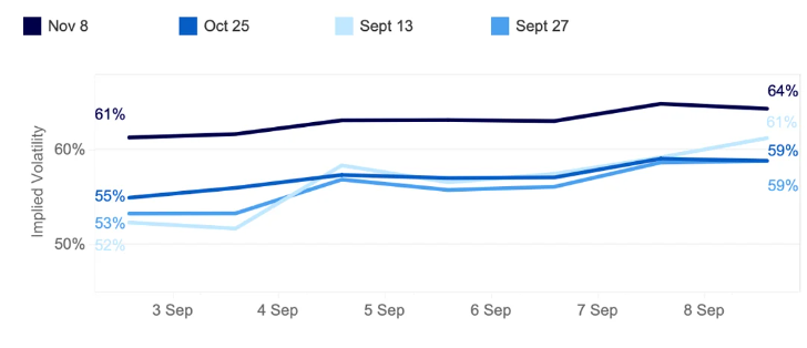 Noterbart är att korttids optioner som löper ut har sett den skarpaste ökningen, med utgången den 13 september som hoppade från 52% till 61%, vilket överstiger kontrakt som löper ut vid månadens slut. För gemene man, när korttids underförstådd volatilitet överstiger långsiktiga mått, indikerar det ökad marknadsstress, kallad en “inverterad struktur”.