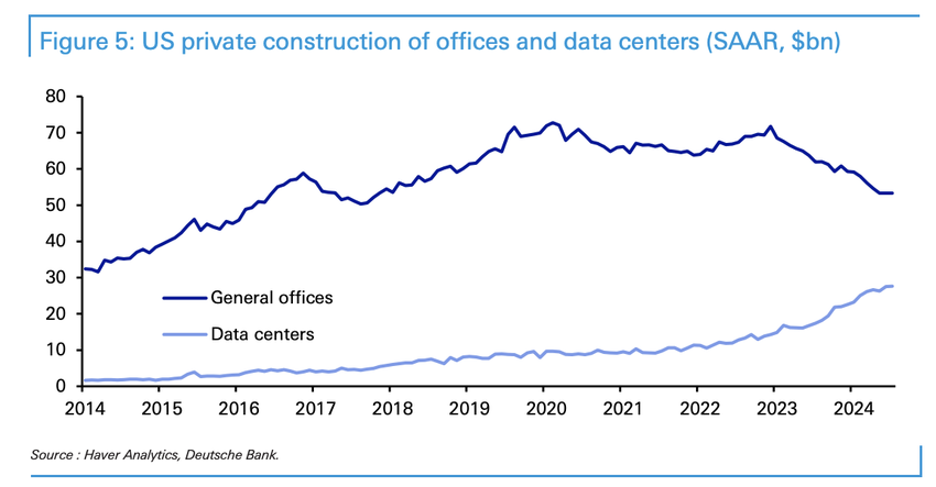 För det andra är byggandet av datacenter på uppgång. Som fysiska konstruktioner, noterar Deutsche Bank, har datacenter vuxit snabbt på den amerikanska marknaden medan traditionella kontorsutrymmen är på nedgång. Många av dessa datacenter kan enkelt användas för AI-ändamål, och tillhörande behov som datorkretsar och elektrisk infrastruktur växer för att möta denna möjlighet.