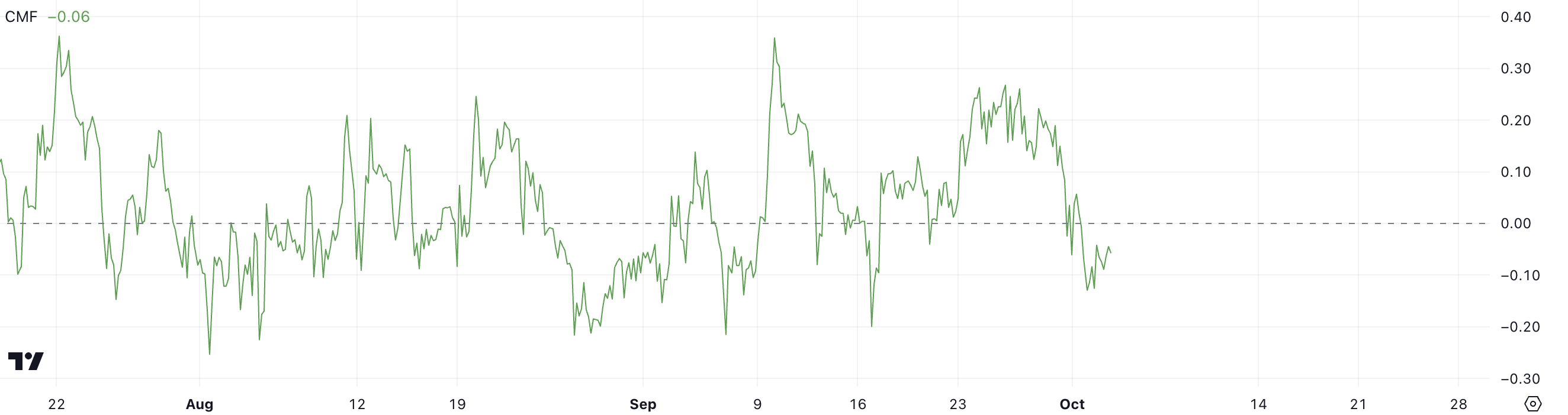 Under de senaste veckorna har CMF fluktuerat över och under nollinjen, vilket indikerar växlande perioder av dominans för köp och försäljning. Topparna över 0,20 i mitten av augusti och igen i slutet av september tyder på korta perioder av starkare köptryck.