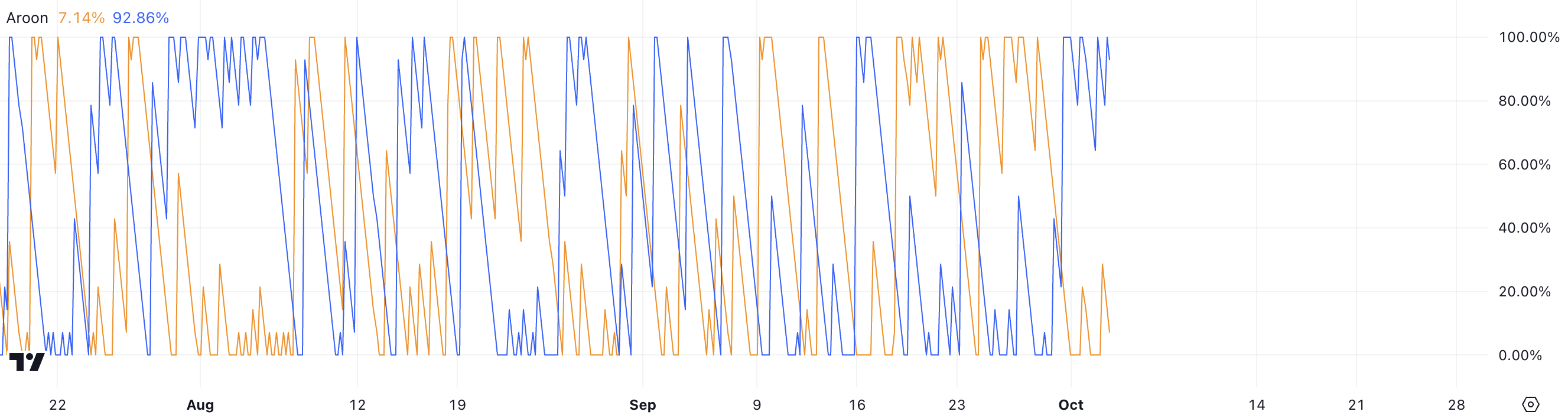 Å andra sidan, när Aroon Down är nära 100%, indikerar det att tillgången har gjort ett nytt lågt värde, vilket signalerar en stark negativ trend. Samspel mellan dessa två linjer hjälper handlare att bedöma om en tillgång är trendande, i vilken riktning och styrkan i den trenden.