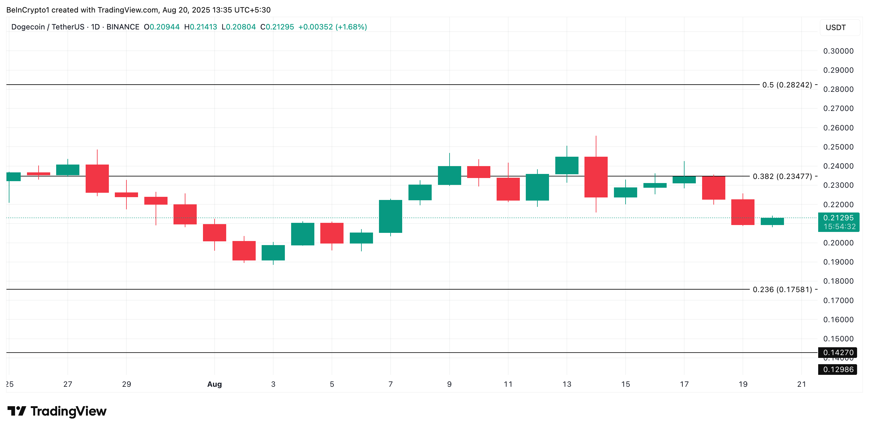 Dogecoins (DOGE) pris har sjunkit sedan 17 augusti och tappat ungefär 9 % av sitt värde de senaste tre dagarna.