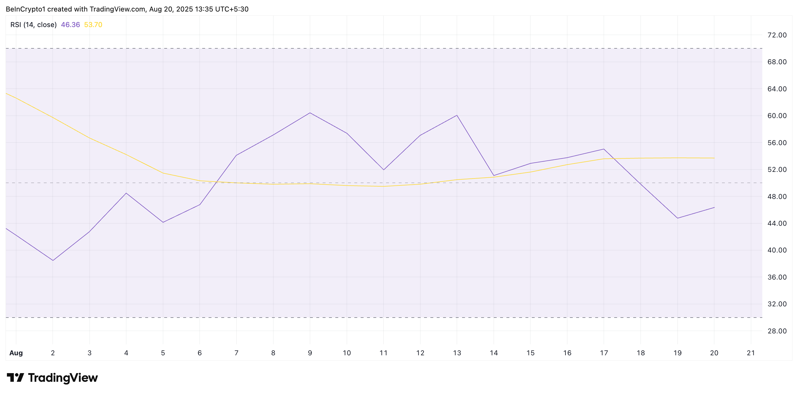 För närvarande kämpar DOGE:s Relative Strength Index (RSI) under 50-neutral linjen, vilket stödjer denna negativa utsikt. Det ligger på 46,36, vilket återspeglar den avtagande köpsidan bland marknadsdeltagare.