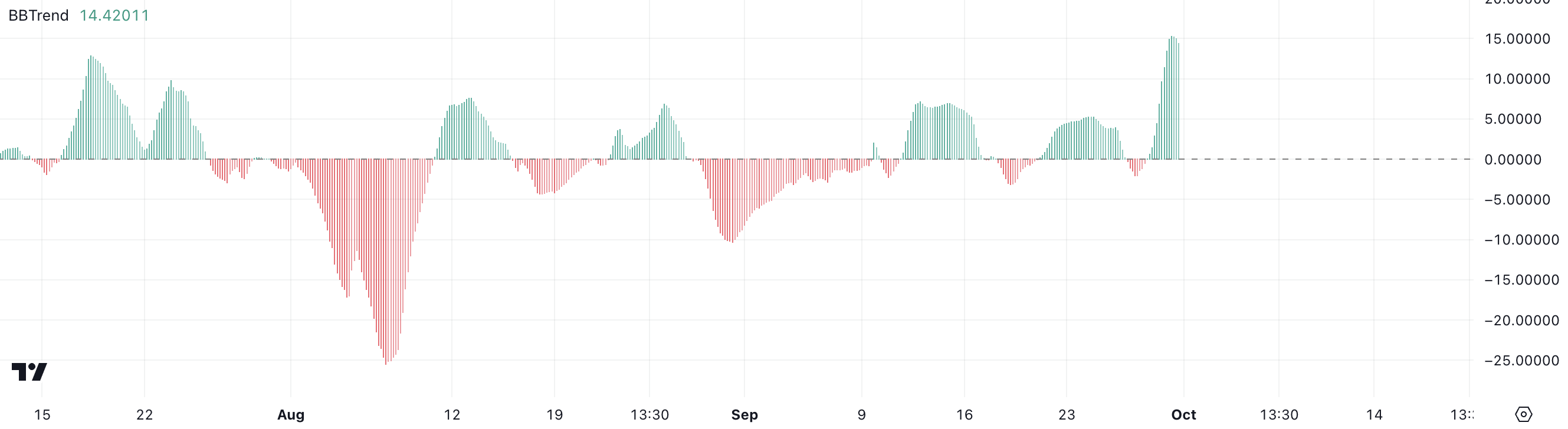 DOGE:s BBTrend steg nyligen till sin högsta nivå sedan maj 2024, och översteg 15, vilket är en tydlig signal om betydande hausseartad momentum. Denna topp markerade en stark uppåtkraft på marknaden, där DOGE drevs av ökat köpintresse och volatilitet.