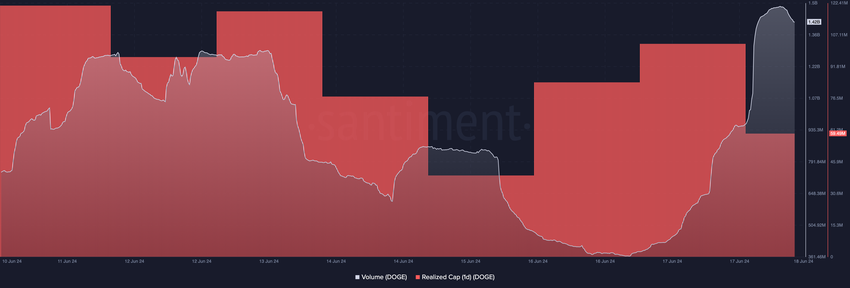 Låt oss nu titta på myntets prispotential. Ur ett on-chain-perspektiv analyserar BeInCrypto Dogecoins volym och realiserade tak.