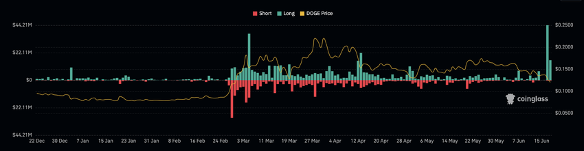 Enligt Coinglass uppgick DOGE-likvidationerna mellan den 17 och 18 juni till 60,27 miljoner dollar. På måndagen var värdet av likvidationerna 44,21 miljoner dollar, medan utplåningen i skrivande stund är 16,06 miljoner dollar.