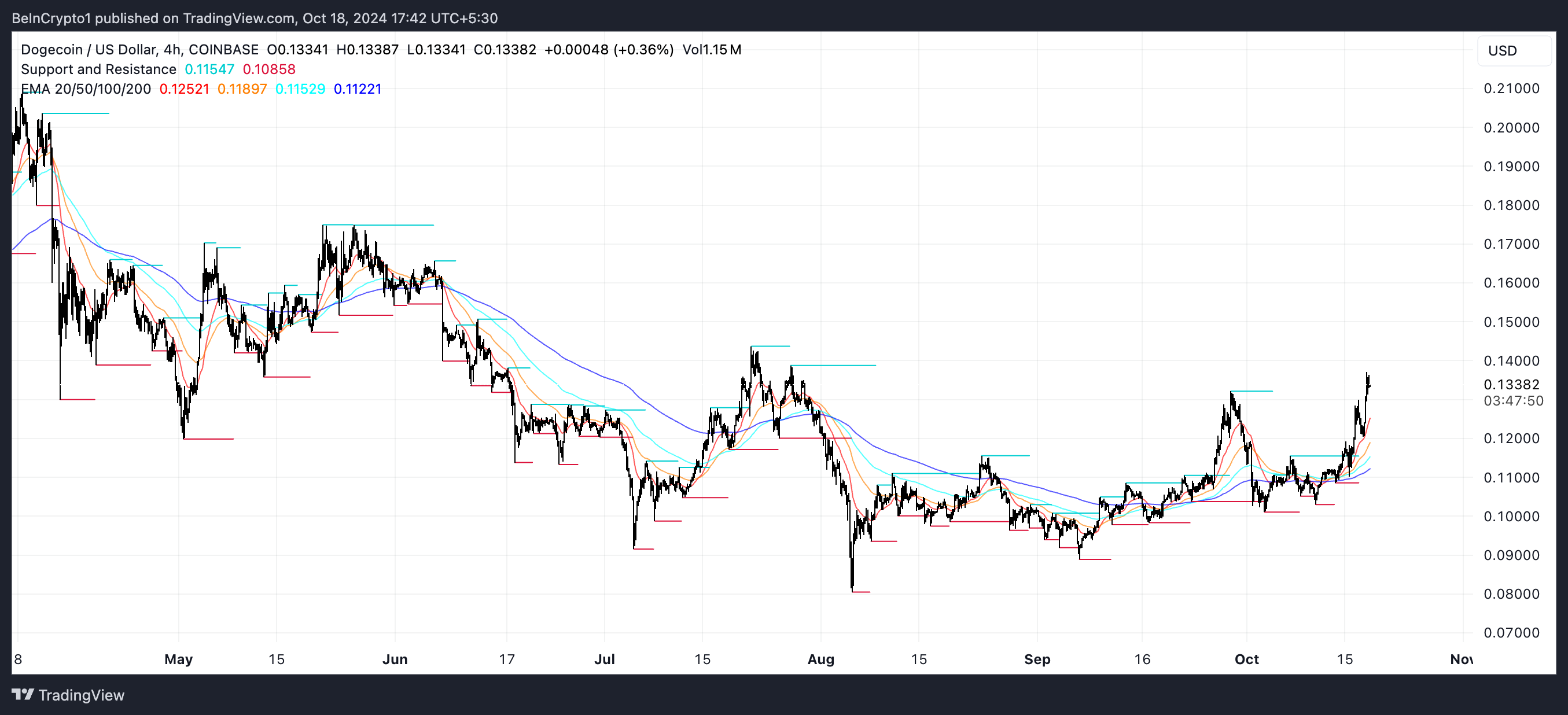 Dogecoin (DOGE) priset har ökat med 10% under de senaste 24 timmarna, vilket har fångat handlarnas uppmärksamhet med ökad aktivitet. Den senaste ökningen i handelsvolym och trendindikatorer som ADX visar på ett växande intresse på marknaden. Denna positiva utveckling stöds ytterligare av placeringen av DOGE:s EMA-linjer, vilket pekar på en möjlig fortsättning av upptrenden.