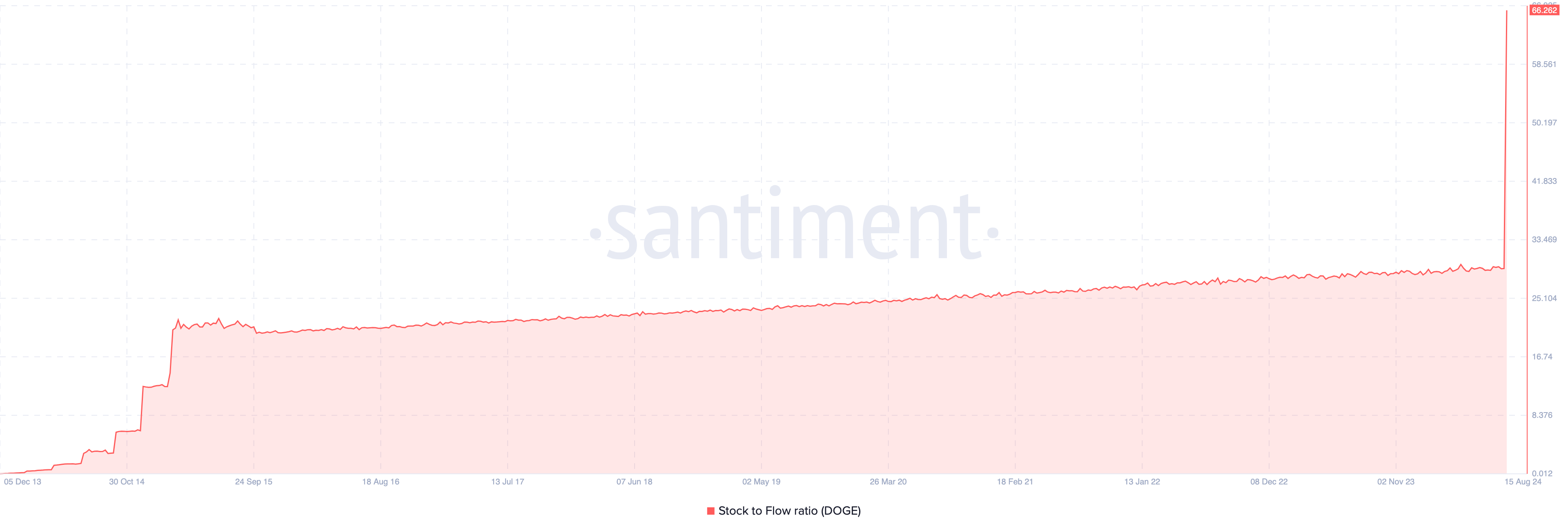 Enligt Santiment hoppade Dogecoins stock-to-flow-förhållande till 69,25 — en historiskt hög nivå för denna mätare. Denna ovanliga topp är en positiv signal för DOGE:s pris, eftersom det antyder en tillfällig brist på kryptomyntet.