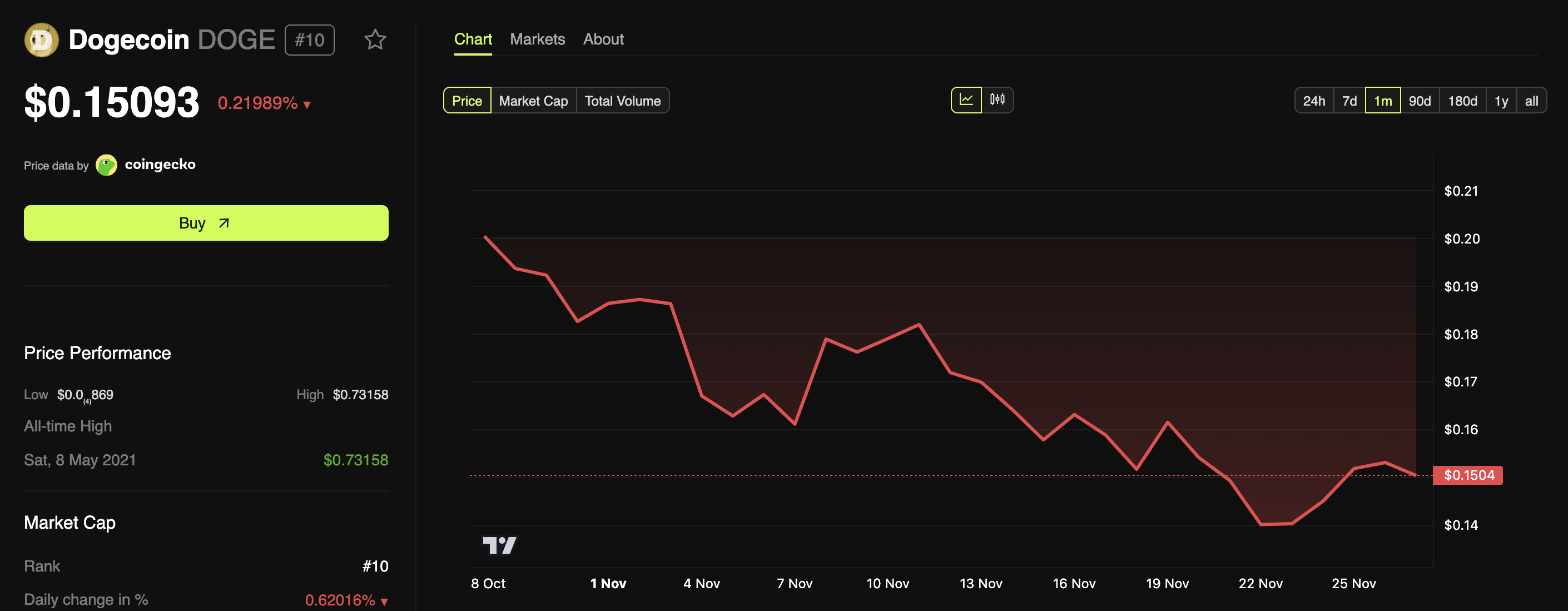 Enligt BeInCrypto Markets-data har memmyntet sjunkit 0,219 % de senaste 24 timmarna. Vid skrivande stund handlades det till 0,15 USD.
