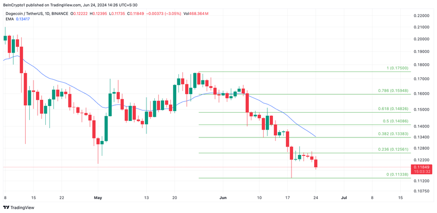 Myntets pris har legat under sitt 20-dagars exponentiella glidande medelvärde (EMA) sedan den 7 juni.