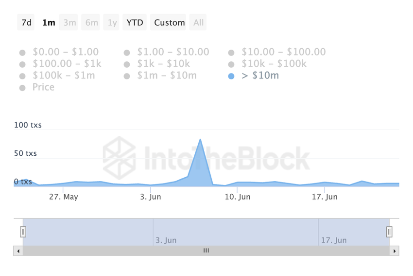Till exempel har det skett en ökning av det dagliga antalet stora transaktioner under den senaste månaden. Antalet DOGE-transaktioner värda över 10 miljoner dollar har ökat med över 150% under de senaste 30 dagarna.