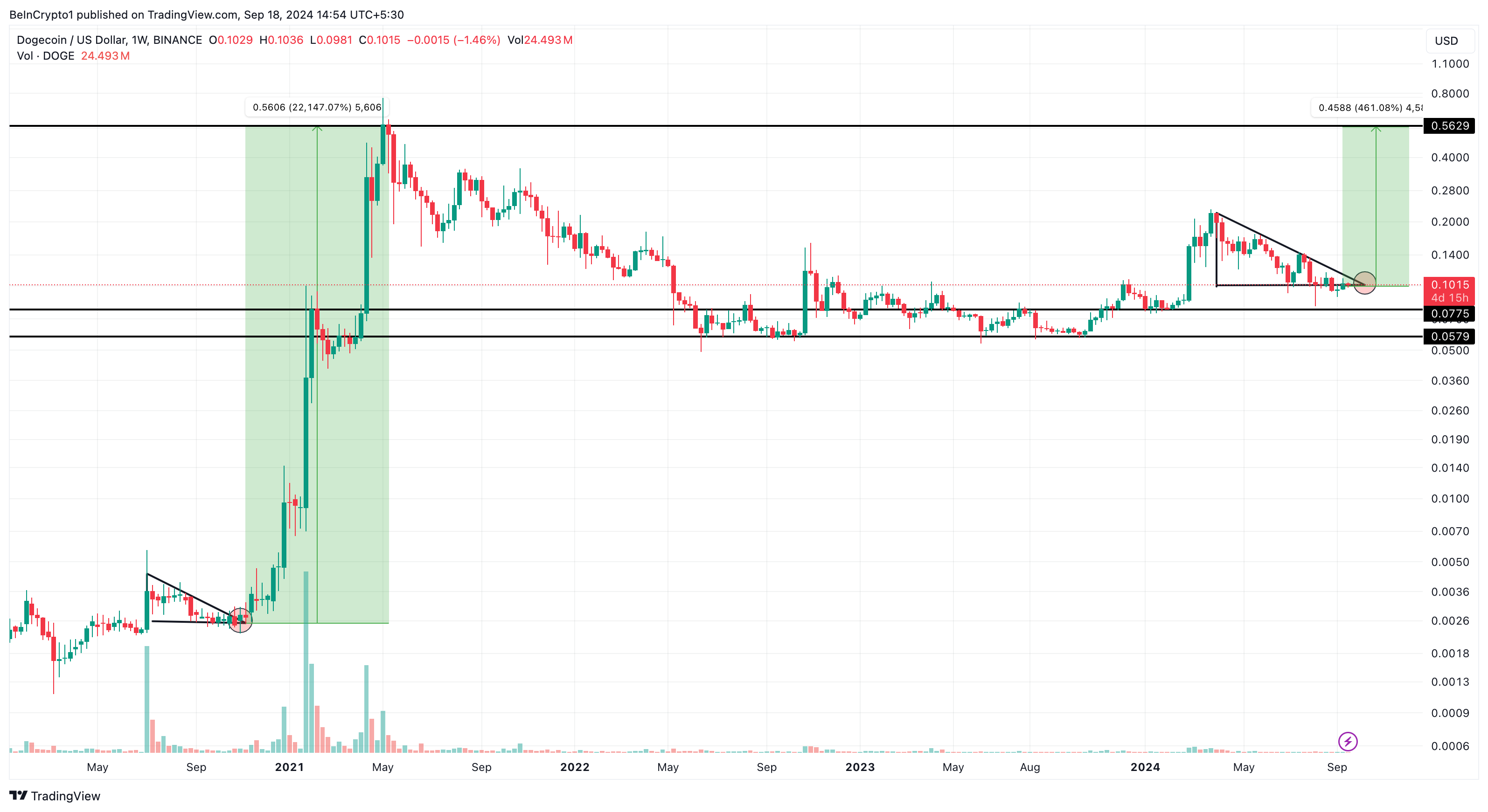 För närvarande handlas Dogecoin (DOGE) till 0,10 USD, och ett mönster av en nedåtgående triangel har bildats sedan priset toppade på 0,22 USD. Om köptrycket intensifieras kan ett utbrott ske. Historiska trender tyder på att om tidigare prestationer påverkar framtida rörelser, kan DOGE:s pris öka med upp till 461%, potentiellt nå 0,56 USD.