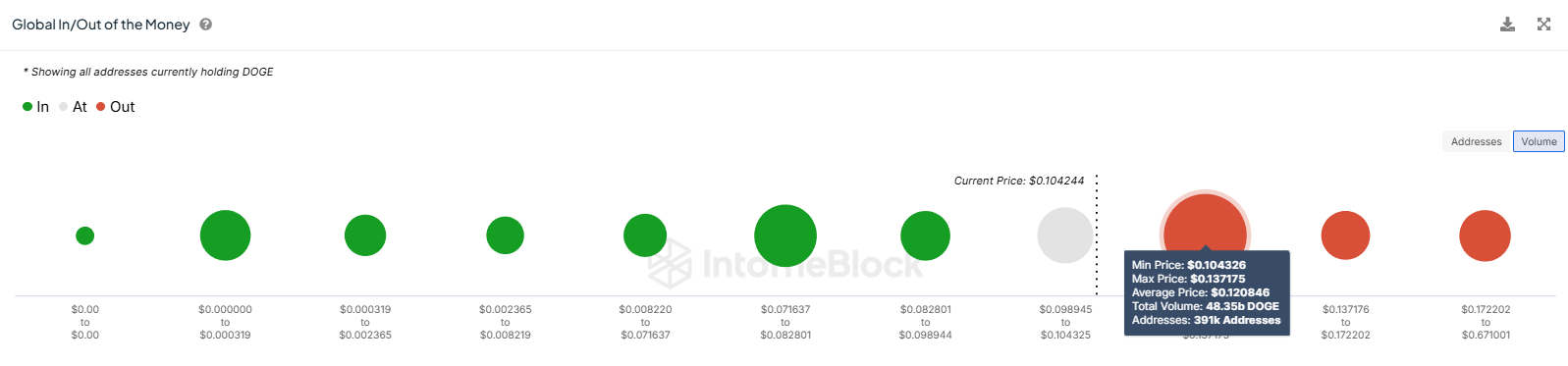 Indikatorn Global In/Out of the Money (GIOM) visar på ett betydande motstånd vid 0,108 USD. Detta är en kritisk punkt eftersom mer än 48,3 miljarder DOGE, värda över 5,2 miljarder USD, har köpts mellan 0,104 och 0,137 USD. Investerare som håller mynt inom detta intervall kommer sannolikt att sälja vid första tecken på vinst, vilket skapar en stor säljvägg som kan hindra en uppåtgående rörelse.