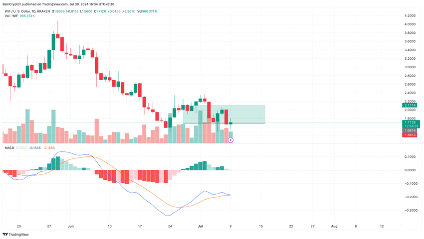 En positiv avläsning av MACD indikerar ett hausseartat momentum, medan en negativ avläsning tyder på något annat. Således tyder avläsningen vid presstillfället på att WIF:s momentum är hausseartat, och ett inträde mellan $1,68 och $1,72 kan ge vinster när priset försöker testa $2,11 igen.