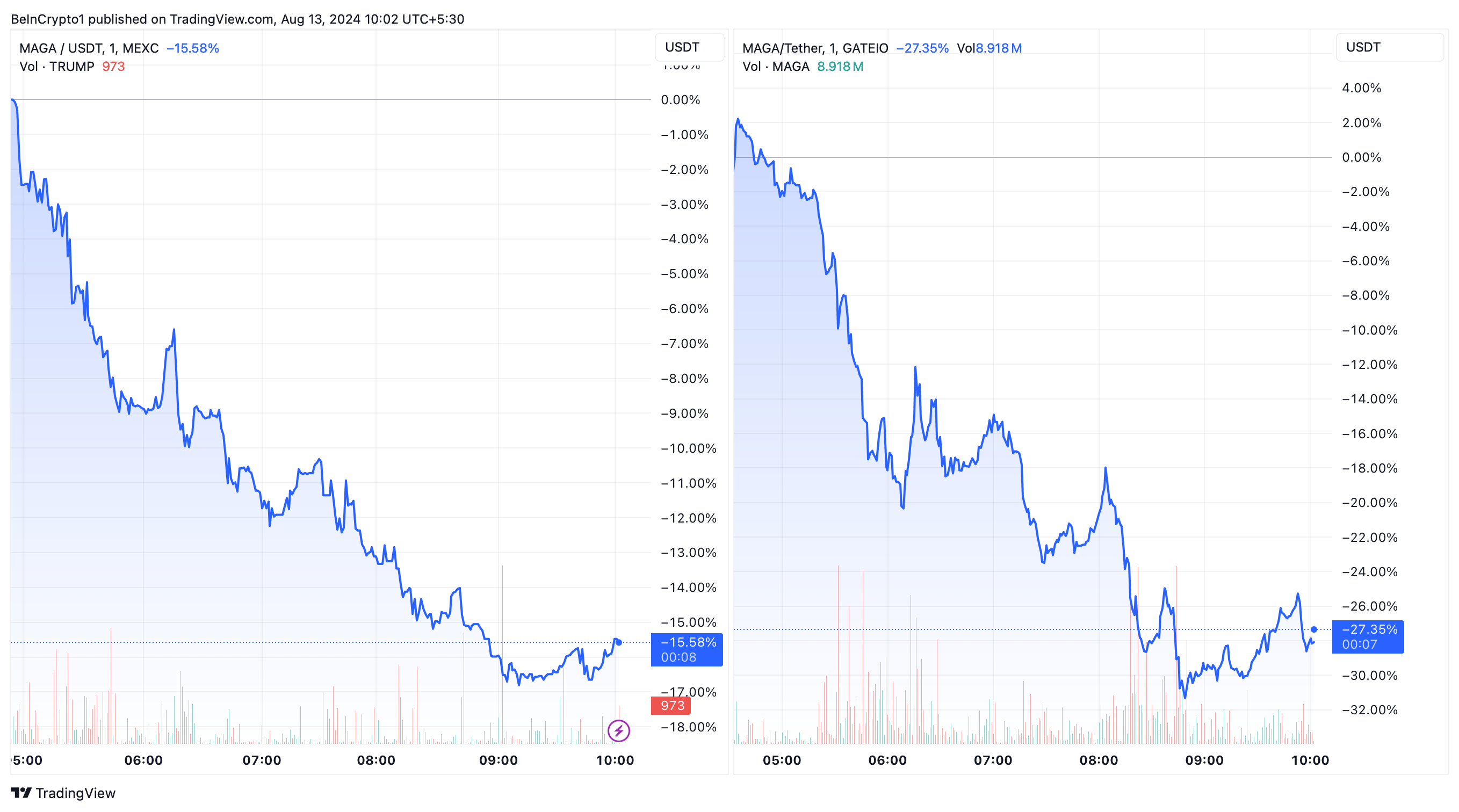 Dessutom ledde bristen på kryptodiskussion också till en kraftig nedgång i värdet på flera meme-mynt med Donald Trump-tema. Specifikt rasade MAGA (Trump) och MAGA (MAGA) meme-mynt, som hade skjutit i höjden i värde i väntan på intervjun, med cirka 15,58 % respektive 27,35 % när diskussionen utvecklades.