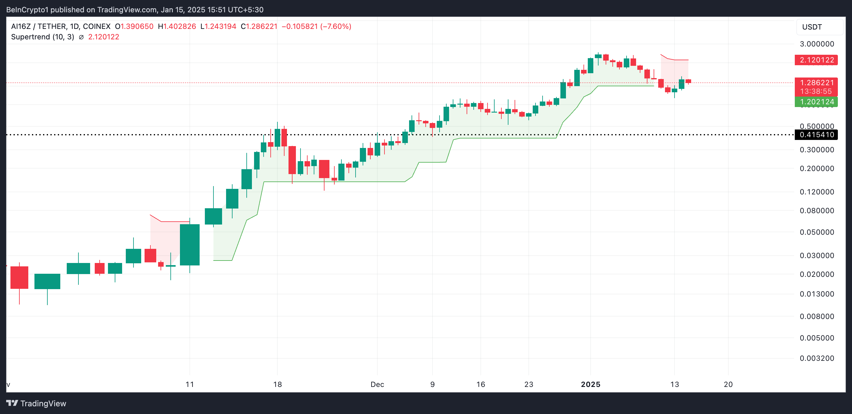 Vidare ligger altcoinets pris under den röda linjen i dess Super Trend-indikator, vilket bekräftar den starka baisseartade tendensen mot det. I skrivande stund bildar AI16Z:s Super Trend dynamiskt motstånd över dess pris vid 2,12 USD.