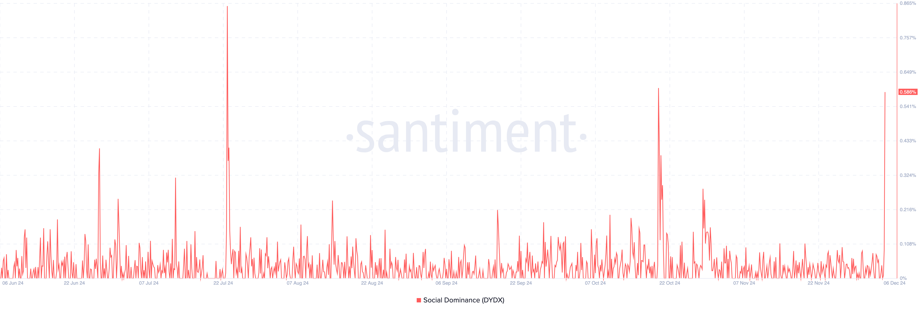 När mätningen ökar betyder det att det finns fler samtal om kryptovalutan jämfört med andra i topp 100. Å andra sidan indikerar en minskning motsatsen. Vid skrivande stund har DYDX:s sociala dominans ökat till 0,59 %.