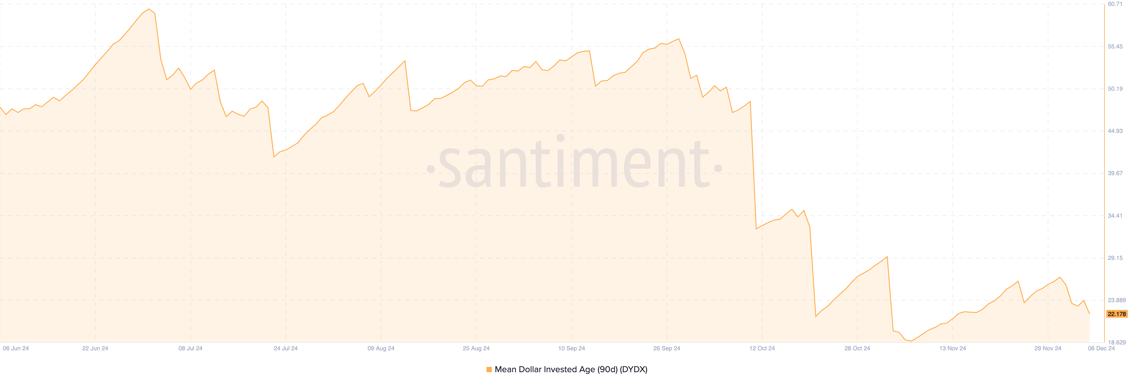 MDIA mäter den genomsnittliga åldern på alla investerade dollar i en kryptovaluta och kan återspegla marknadsfaser. Vanligtvis antyder en stigande MDIA tokenstagnation, vilket ofta hämmar prisökning.
