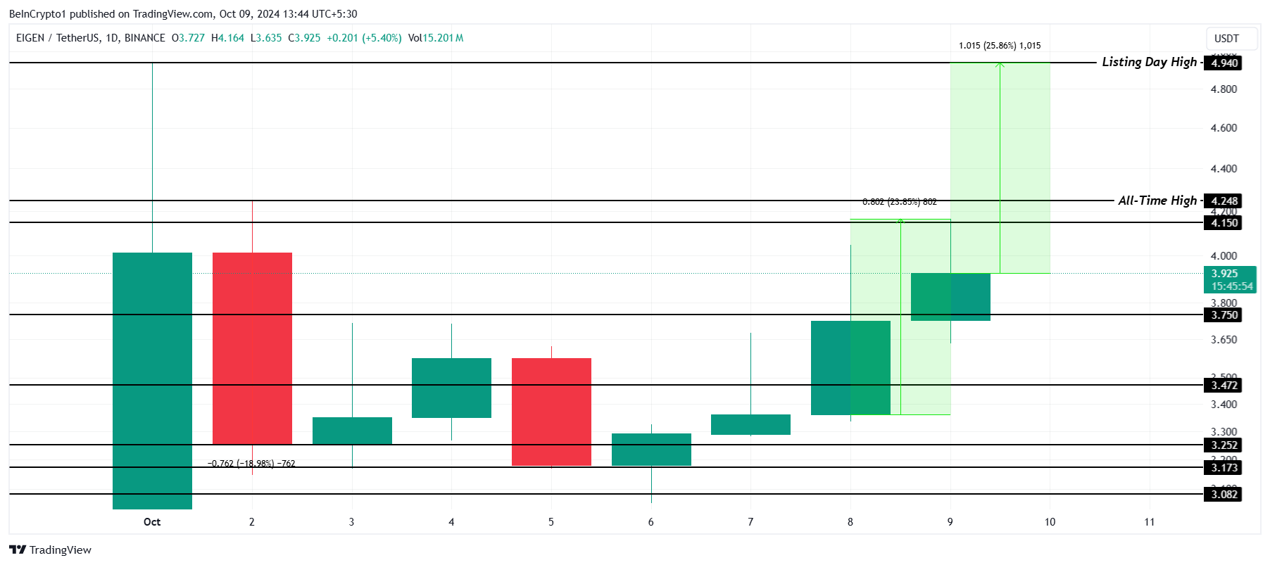 EIGEN har sett en ökning på 23% under de senaste 24 timmarna, med ett nuvarande handelspris på 3,92 USD. Kryptovalutan närmar sig en viktig motståndsnivå på 4,15 USD. Att bryta igenom denna nivå skulle bana väg för ytterligare vinster, med en potentiell ökning till 4,24 USD, vilket skulle markera ett nytt ATH.
