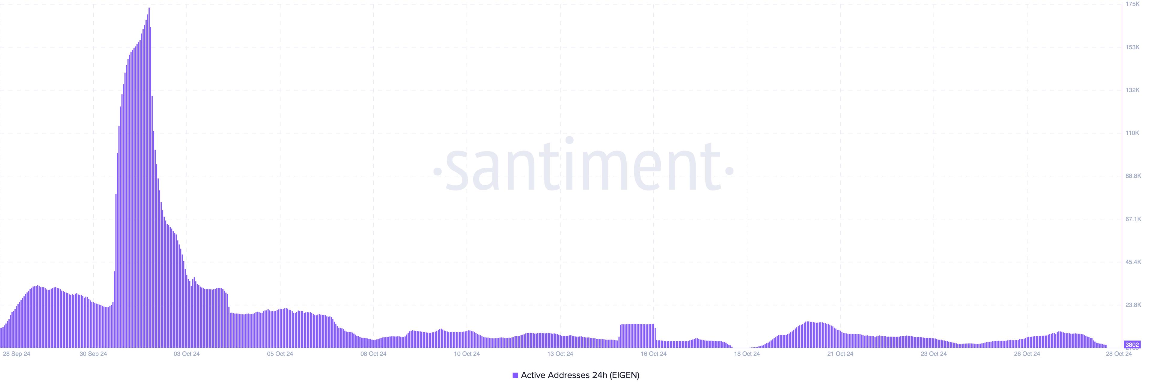 Data från Santiment visar att bara en dag efter att EIGEN blev handelbar, interagerade över 173 000 adresser med token. Men nu har detta antal sjunkit till färre än 4 000 aktiva adresser.