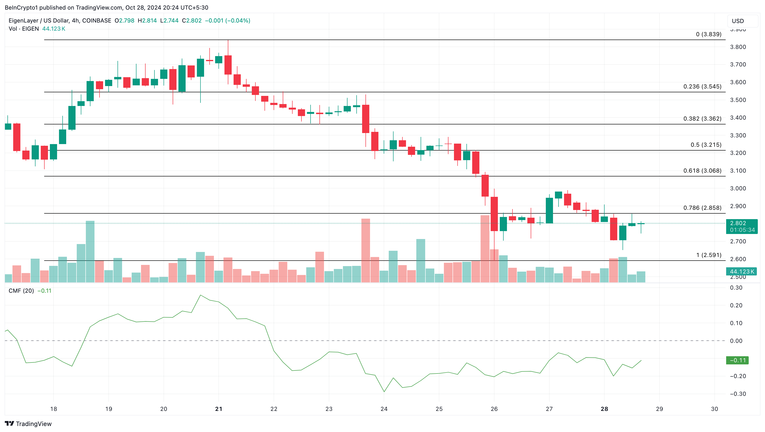 På 4-timmarsdiagrammet kommer EIGENs pris sannolikt att möta motstånd vid 2,86 USD. Detta prisnivå är där 78,6 % Fibonacci retracement-nivån ligger. Historiskt sett, när kryptopriser når denna punkt, krävs mycket köptryck för att överträffa den.