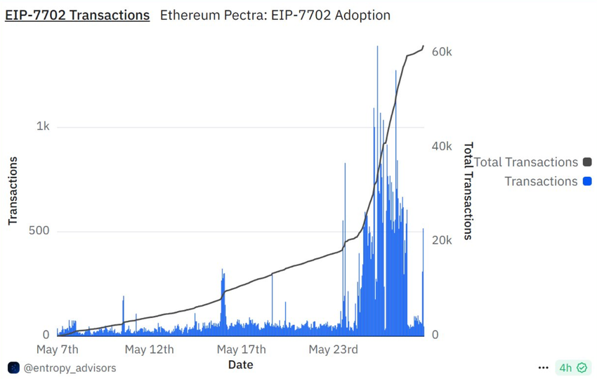 Efter lanseringen av sin senaste uppgradering, Pectra, har Ethereum-nätverket sett en märkbar ökning av EIP-7702-transaktioner.