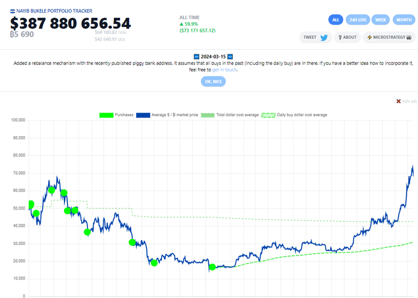 Det är värt att notera att när El Salvadors tidigare inköp och Bitcoin-intäkter från andra kanaler, som dess medborgarskapsprogram, beaktas, uppgår det totala innehavet till 5,690 BTC, värderat till 387.88 miljoner dollar.