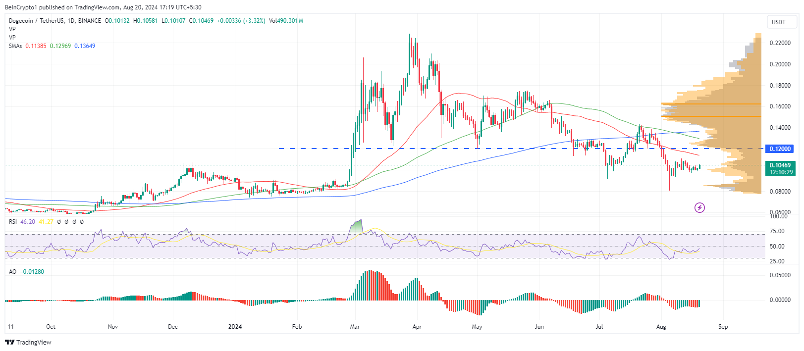 Utifrån det dagliga diagrammet för DOGE/USDT-paret blir Dogecoin en attraktiv köp endast om den bryter och stänger över 0,1200 USD-nivån. Dock stöter den på starkt motstånd, där volymprofilen (orange noder) indikerar att tjurarna väntar på att engagera sig när priset överstiger denna nivå.