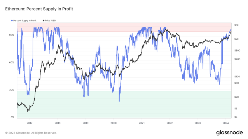 En sådan marknadstopp bildas när mer än 95% av det cirkulerande utbudet är i vinst, och för närvarande är 97,5% av utbudet i vinst. Händelsen inträffade senast i november 2021, då ETH bildade den tidigare heltidshöjden.