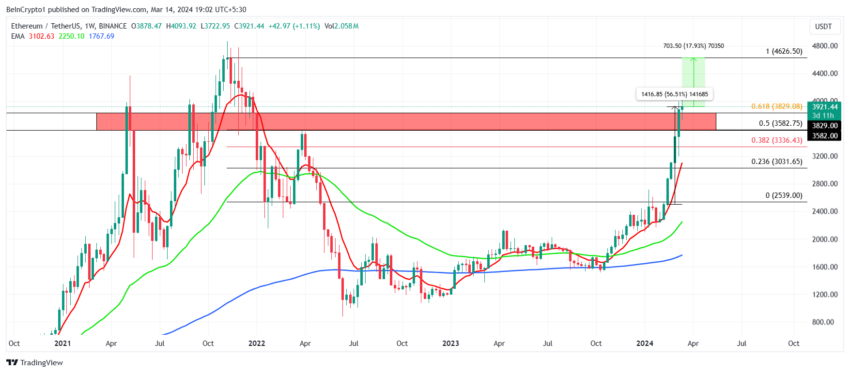 Ethereum-priset kunde ses handla till 3,921 XNUMX dollar i skrivande stund. Den näst största kryptovalutan i världen har vuxit med 56% under den senaste månaden och stigit från 2,500 dollar till handelspriset.